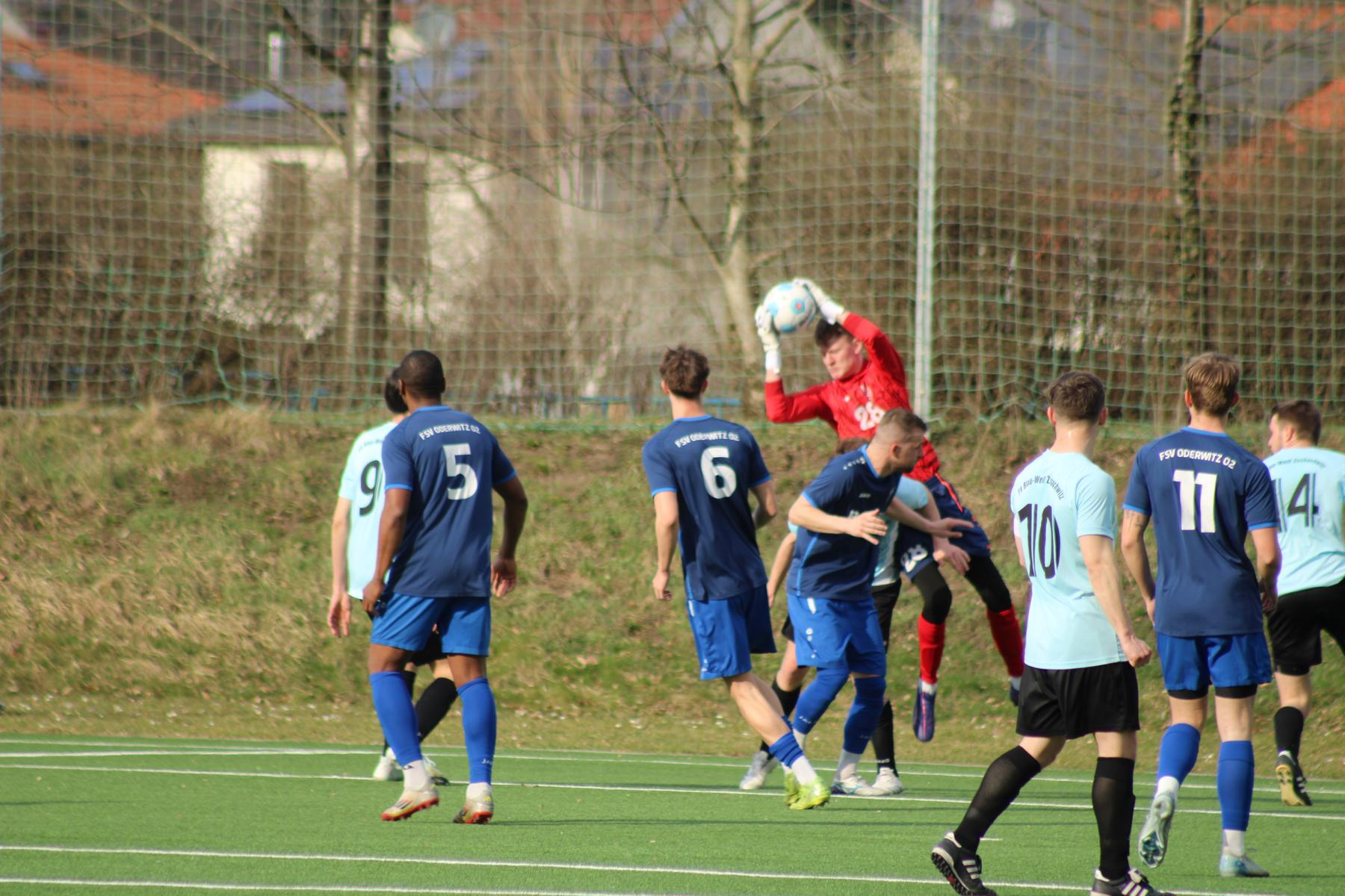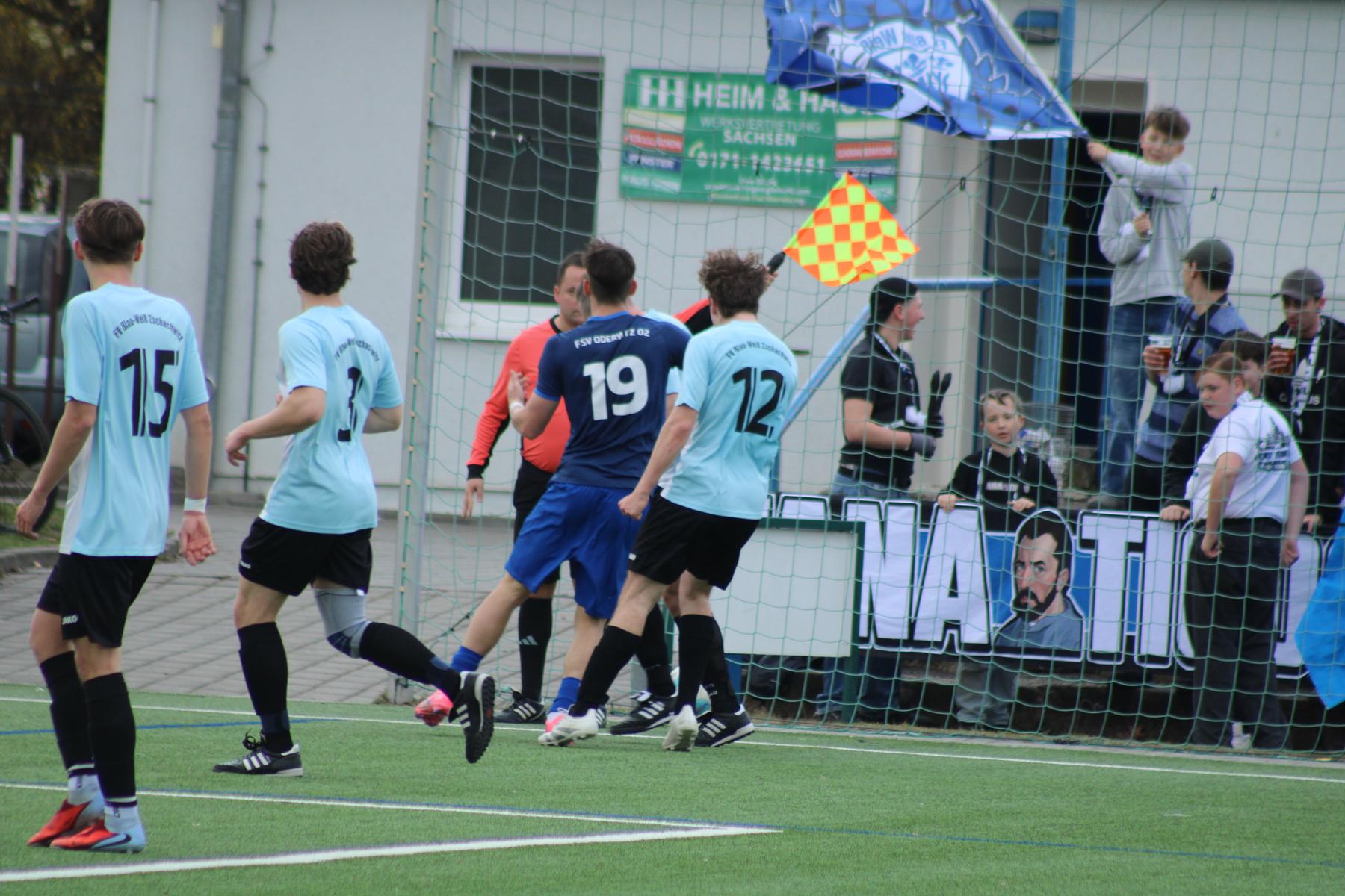 Die Uhren zeigten die 52. Minute, als die Gäste erst aus Nahdistanz vergaben und wenig später Löwe mit Faustabwehr retten konnte. In der 55. Minute Freistoß an der Mittellinie für Blau-Weiß. Der Ball kommt zu Schneider, der im schnellen Sprint bis vor das Oderwitzer Tor läuft, wird aber etwa zwei Meter vor dem Tor von der Abwehr geblockt. Als auch Birkner in guter Schussposition den Ball vergibt, kontern die Gäste über die rechte Seite mit einem Torschuss, der am äußeren Tornetz landete. Nochmals große Gelegenheit, als der laufstarke Nguyen aus etwa acht Metern den Ball über die Querlatte schießt. Ein Kopfball von Donath geht knapp am Gästetor vorbei und als Goldberg drei Abwehrspieler ausgespielt hatte, bringt er zehn Meter vor dem Tor ein Abspiel zu Zumpe. Leider konnte ein Abwehrspieler mit der Fußspitze den Torschuss verhindern.