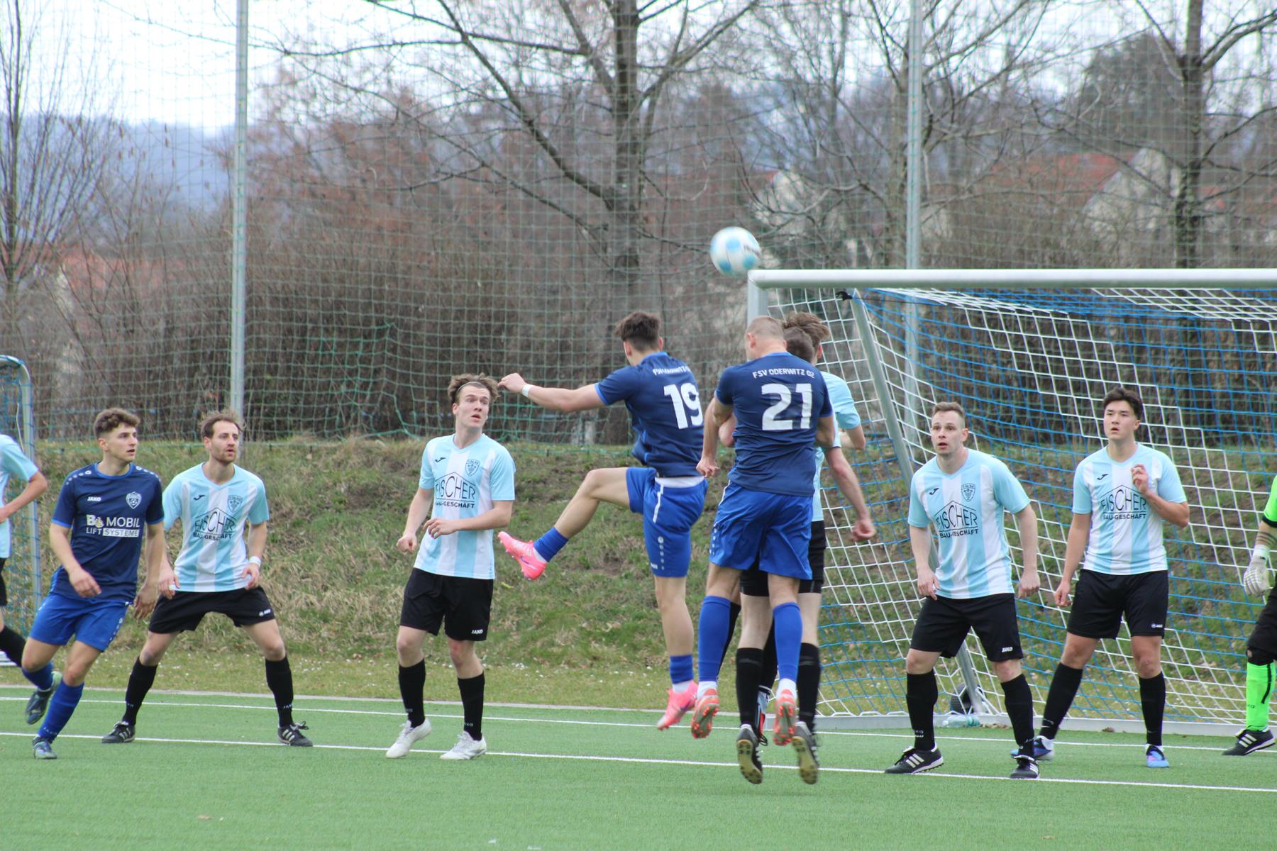 Da bei Blau-Weiß die Torhüter Sauer und Meyer krank bzw. verletzt sind, war der 49-jährige AH-Torhüter Heiko Löwe freundlicherweise zu seinem zweiten Einsatz in dieser Saison bereit. Es kennzeichnet derzeit die Sorgen unseres Trainerteams, die keinesfalls zu beneiden sind. Unter dem Motto: „Bange machen gilt nicht“ wurde die anfängliche kurze Druckperiode der Gäste gut überstanden. Einen 25-Meter-Freistoß hielt Löwe und Zumpe und Förster klärten mit Befreiungsschlägen bzw. Eckball. Goldberg kam am Oderwitzer Strafraum in Ballbesitz, wurde aber geblockt. Bei einem harmlosen Gegenangriff köpfte Nguyen den Ball zu schwach zu Löwe und so gelang Salich in der 11. Minute das 1:0 für die ganz in Blau spielenden Oderwitzer. Ein Tor der Kategorie „vermeidbar“. Nachfolgend hielt Löwe einen Flachschuss und Domke rettete zur Ecke. Zunehmende Entlastung durch abgewehrte Bälle bei den hellblau-schwarz spielenden Gastgebern und erste gute Chance für Schneider. Mit Ball am Fuß lief er in den gegnerischen Strafraum, wo er wenige Meter vor dem Tor gestoppt wurde. Schade, ein Schussversuch wäre wohl besser gewesen.